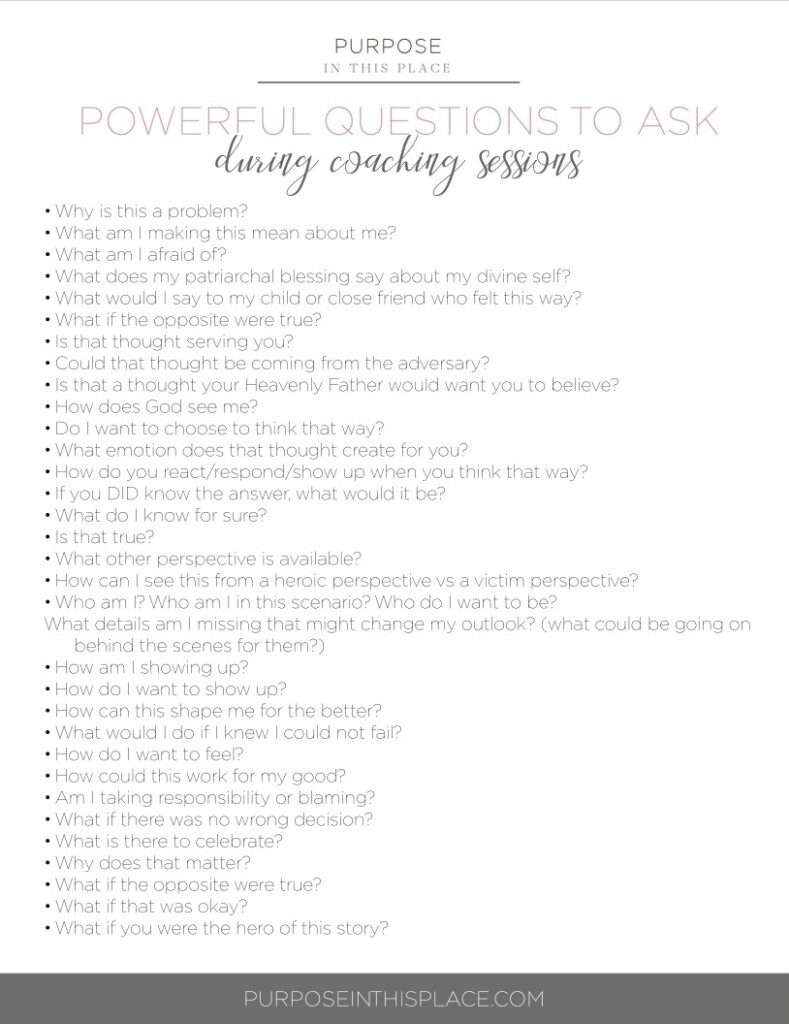 A good question can open the space for people to dig deep and get to the bottom of what they are experiencing. Check out this list of questions to help guide you in your coaching sessions.
